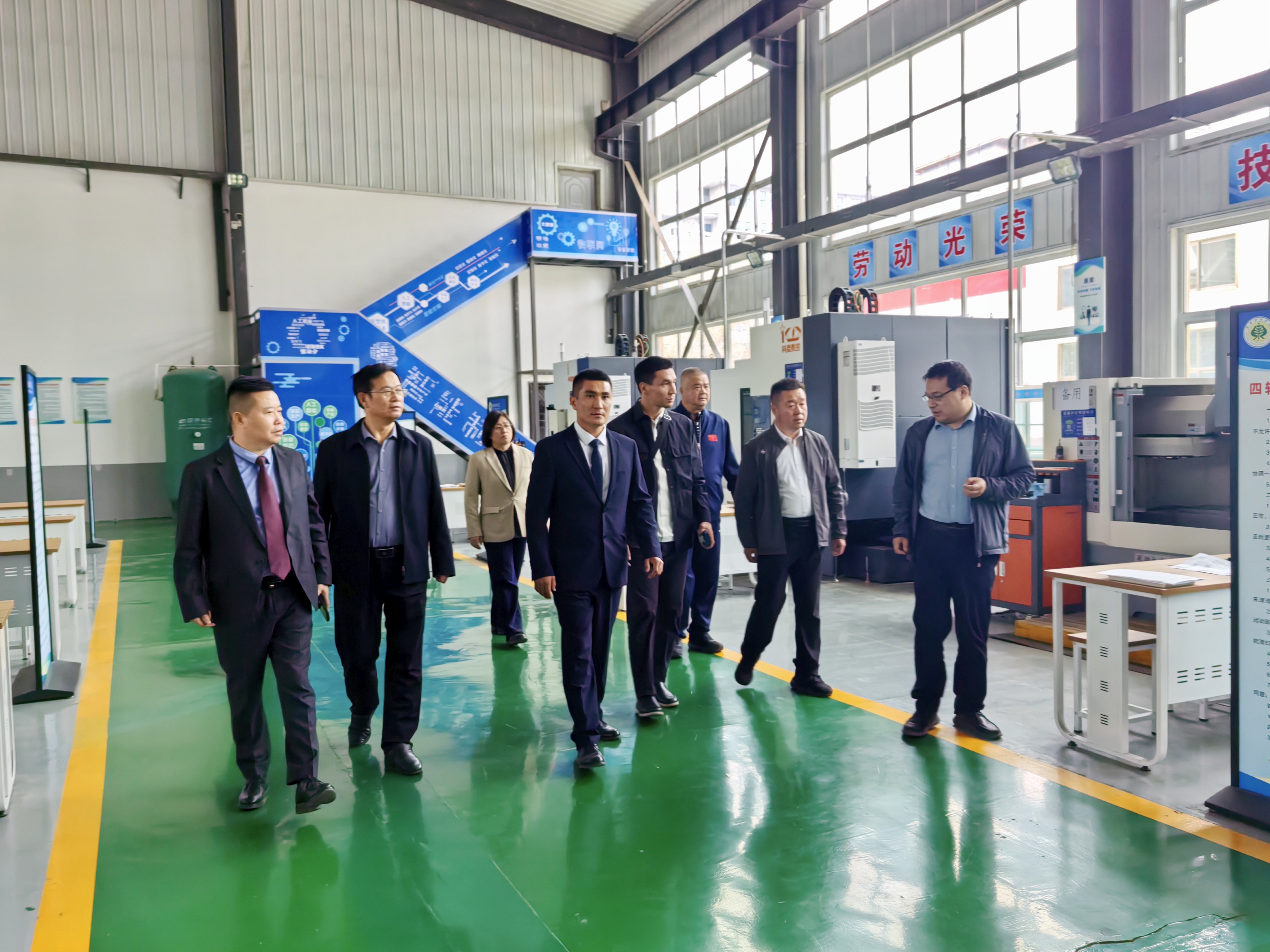 吉爾吉斯斯坦代表一行參觀了我校智能制造實(shí)訓(xùn)基地,張開禮詳細(xì)介紹了學(xué)校在新能源汽車技術(shù)、智能制造等專業(yè)領(lǐng)域的實(shí)訓(xùn)設(shè)施和取得的教學(xué)成果。