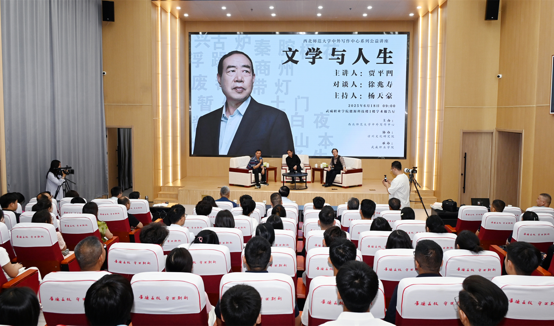近日,西北師范大學中外寫作中心武威基地“文學與人生”公益講座在武威職業(yè)技術(shù)大學舉辦。著名作家、西北師范大學特聘教授賈平凹擔任主講嘉賓,寫作中心常務(wù)副主任徐兆壽教授擔任對談嘉賓,與師生共赴一場思想文化盛宴。講座由西北師范大學中外寫作中心副主任楊天豪主持。