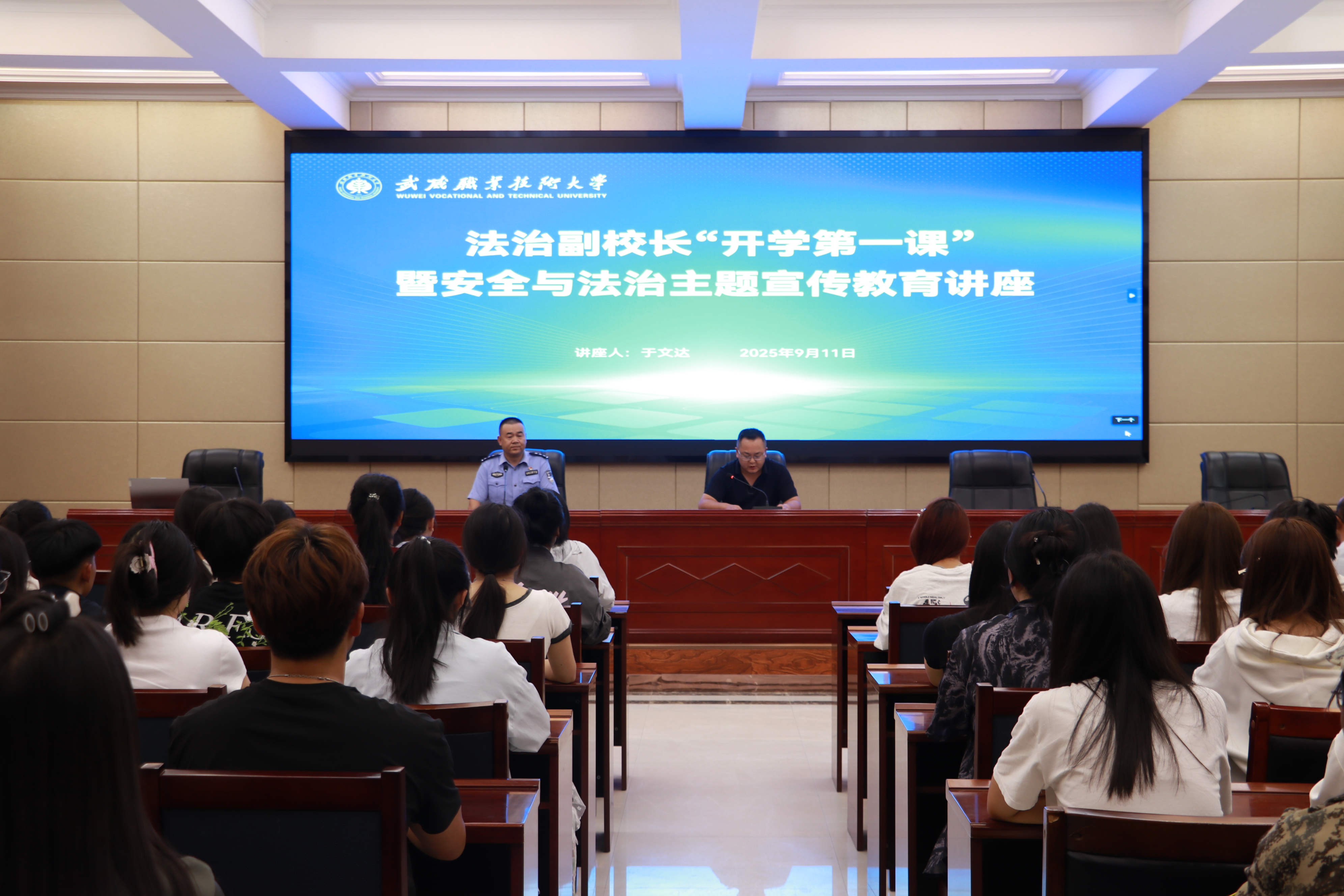為加強(qiáng)師生法治觀念,提高安全意識,9月11日,學(xué)校安全保衛(wèi)處邀請法治副校長于文達(dá)為學(xué)校師生講授2025年秋季學(xué)期“開學(xué)第一課”,開展安全與法治教育專題講座?;顒釉谛袠錁潜眰?cè)報(bào)告廳舉行,活動由安全保衛(wèi)處副處長康興奎主持。