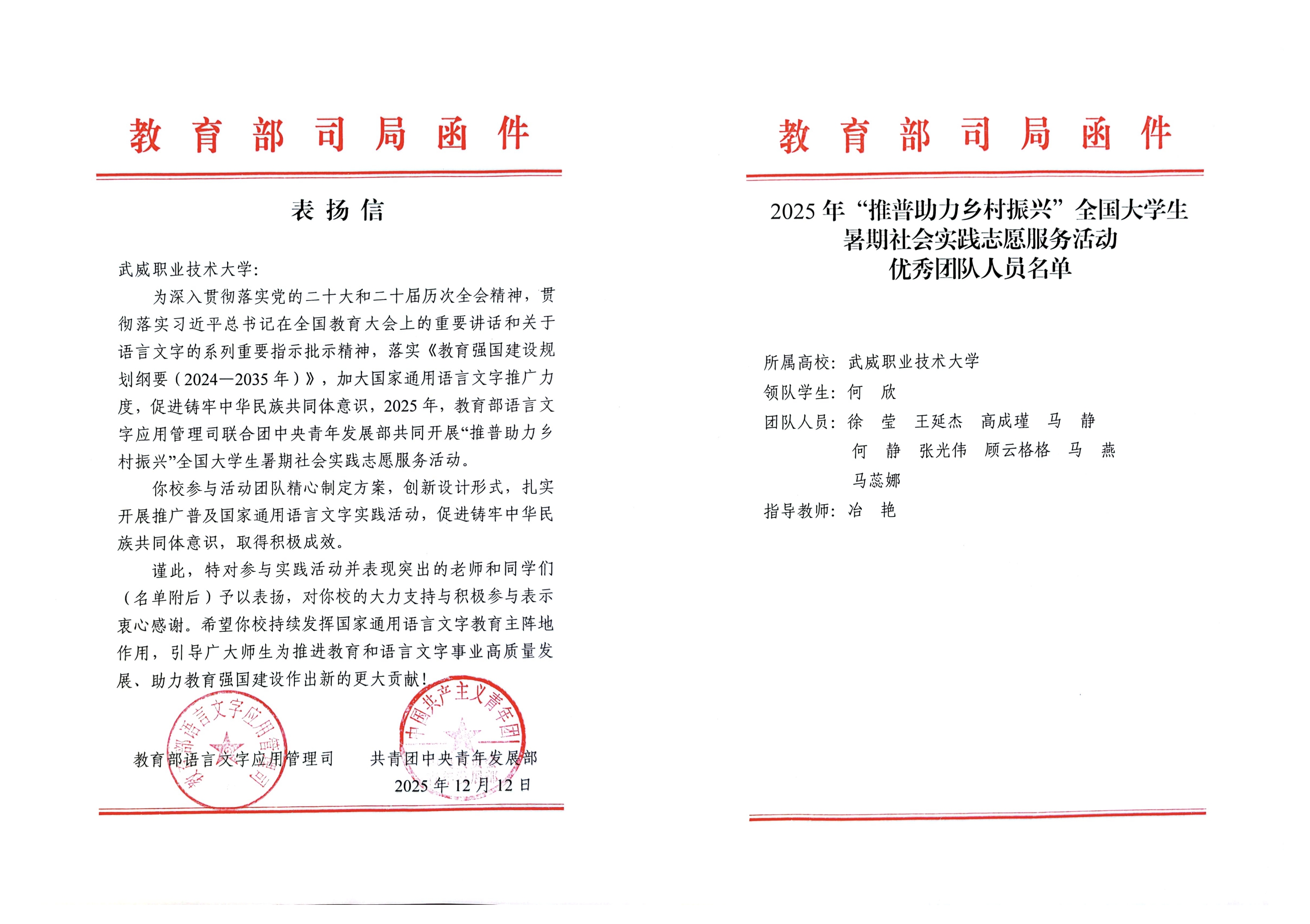 喜報!武威職業(yè)技術(shù)大學(xué)“推普助力·鄉(xiāng)村振興”暑期社會實(shí)踐團(tuán)隊(duì)獲評全國優(yōu)秀團(tuán)隊(duì)