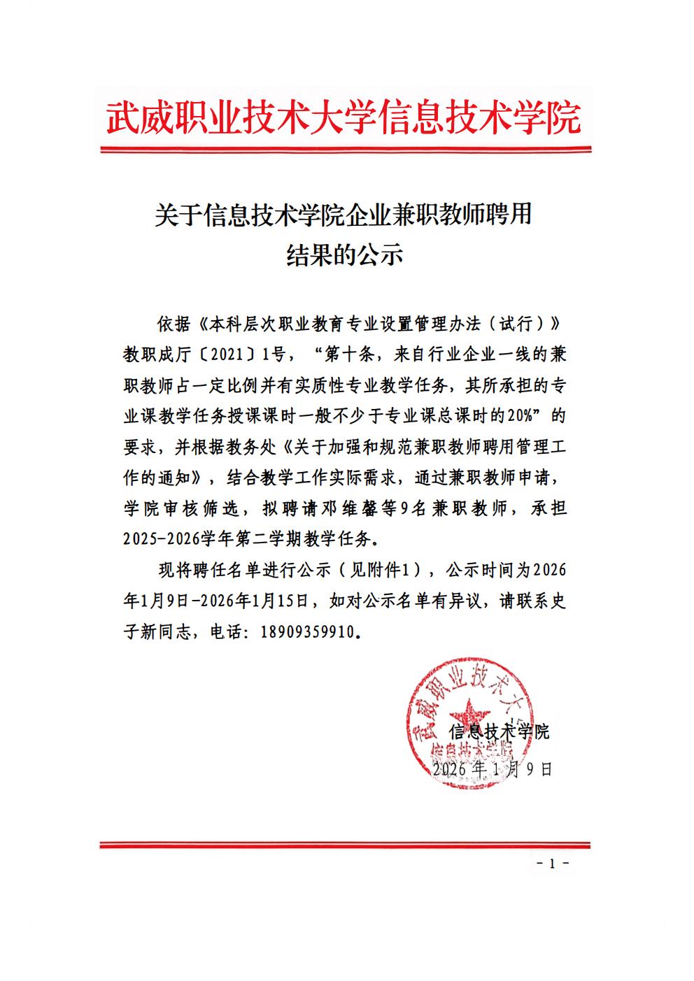 關(guān)于信息技術(shù)學(xué)院2025-2026學(xué)年第2學(xué)期企業(yè)兼職教師聘用結(jié)果的公示