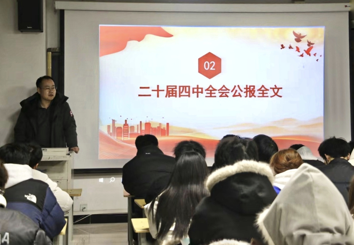 12月5日,學(xué)院黨總支書(shū)記黃述杰率先開(kāi)展專(zhuān)題培訓(xùn),圍繞黨的二十屆四中全會(huì)召開(kāi)的時(shí)代背景、重大意義和核心要義進(jìn)行系統(tǒng)解讀,全體黨員及入黨積極分子參會(huì)學(xué)習(xí)。黃述杰強(qiáng)調(diào),要持續(xù)深化黨的創(chuàng)新理論武裝,將學(xué)習(xí)貫徹黨的二十屆四中全會(huì)精神與學(xué)習(xí)貫徹習(xí)近平新時(shí)代中國(guó)特色社會(huì)主義思想緊密結(jié)合,切實(shí)把學(xué)習(xí)成果轉(zhuǎn)化為推動(dòng)工作的實(shí)際成效;要縱深推進(jìn)“四個(gè)突出”戰(zhàn)略發(fā)展思路,緊扣鑄牢中華民族共同體意識(shí)主線,錨定“十個(gè)較強(qiáng)”發(fā)展目標(biāo),推動(dòng)“鑄牢”工作全面融入專(zhuān)業(yè)建設(shè)、教書(shū)育人全過(guò)程各方面;要聚焦教育教學(xué)主責(zé)主業(yè),持續(xù)深化“大學(xué)風(fēng)”建設(shè)與課程思政改革,著力在抓落實(shí)、抓基層、抓學(xué)風(fēng)上實(shí)現(xiàn)新突破、取得新成效。