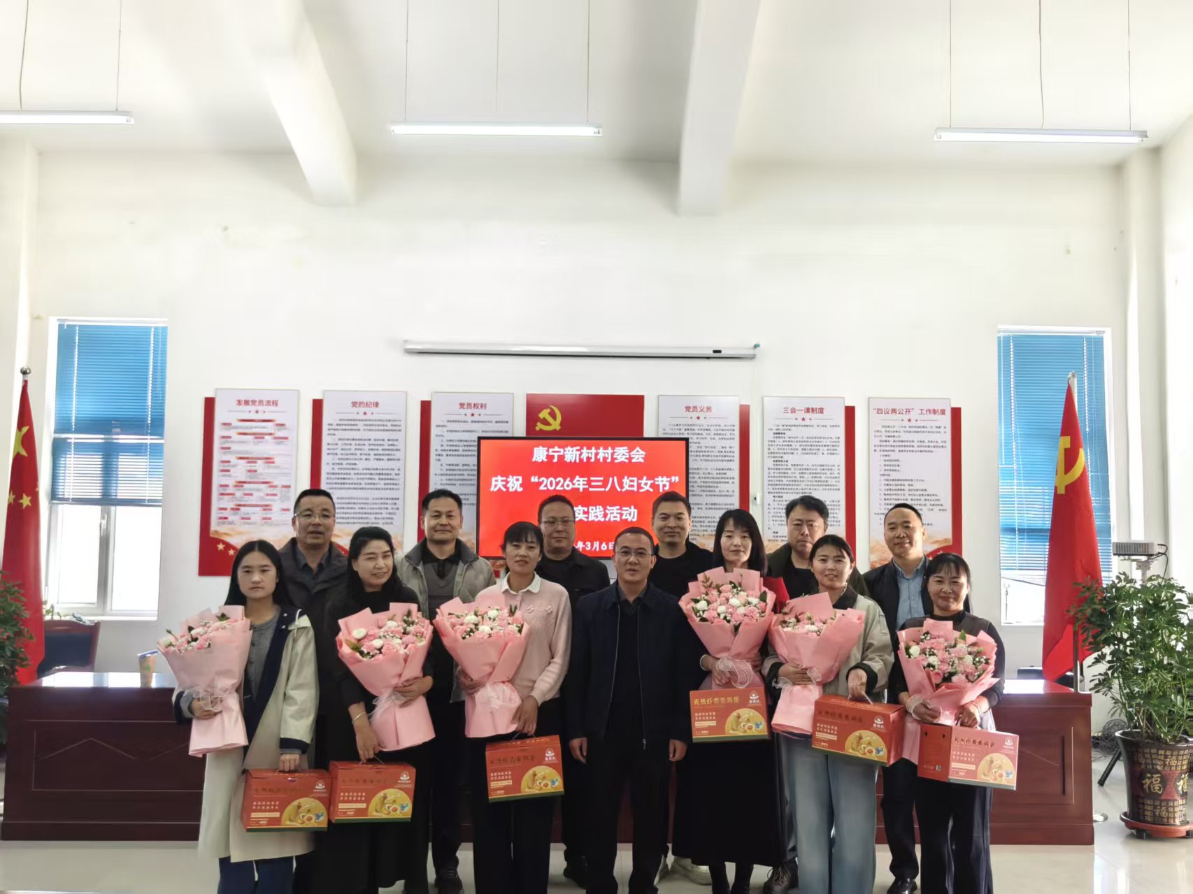講座結束后,學校駐村幫扶工作隊與康寧、幸福新村聯(lián)合開展了“三八婦女節(jié)”慶?;顒樱瑸椤按鍍晌眿D女同志送上了鮮花、節(jié)日禮品和美好祝福。