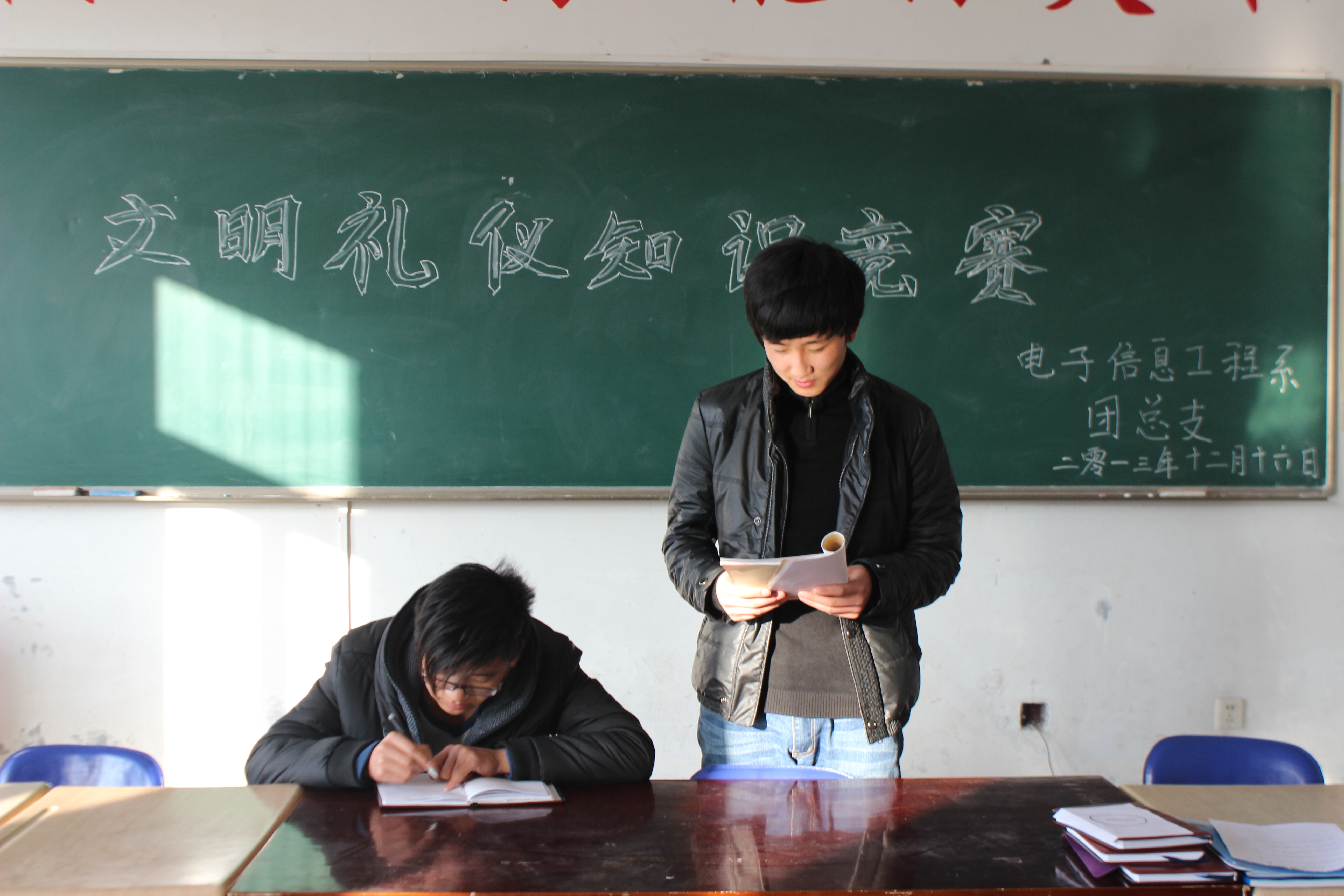 2013年12月16日晚,電子信息工程系團(tuán)總支在1-304教室組織開展電信系文明禮儀知識(shí)競(jìng)賽;來自電信系2012、2013級(jí)8個(gè)大專班的24名同學(xué)參加此次活動(dòng)。