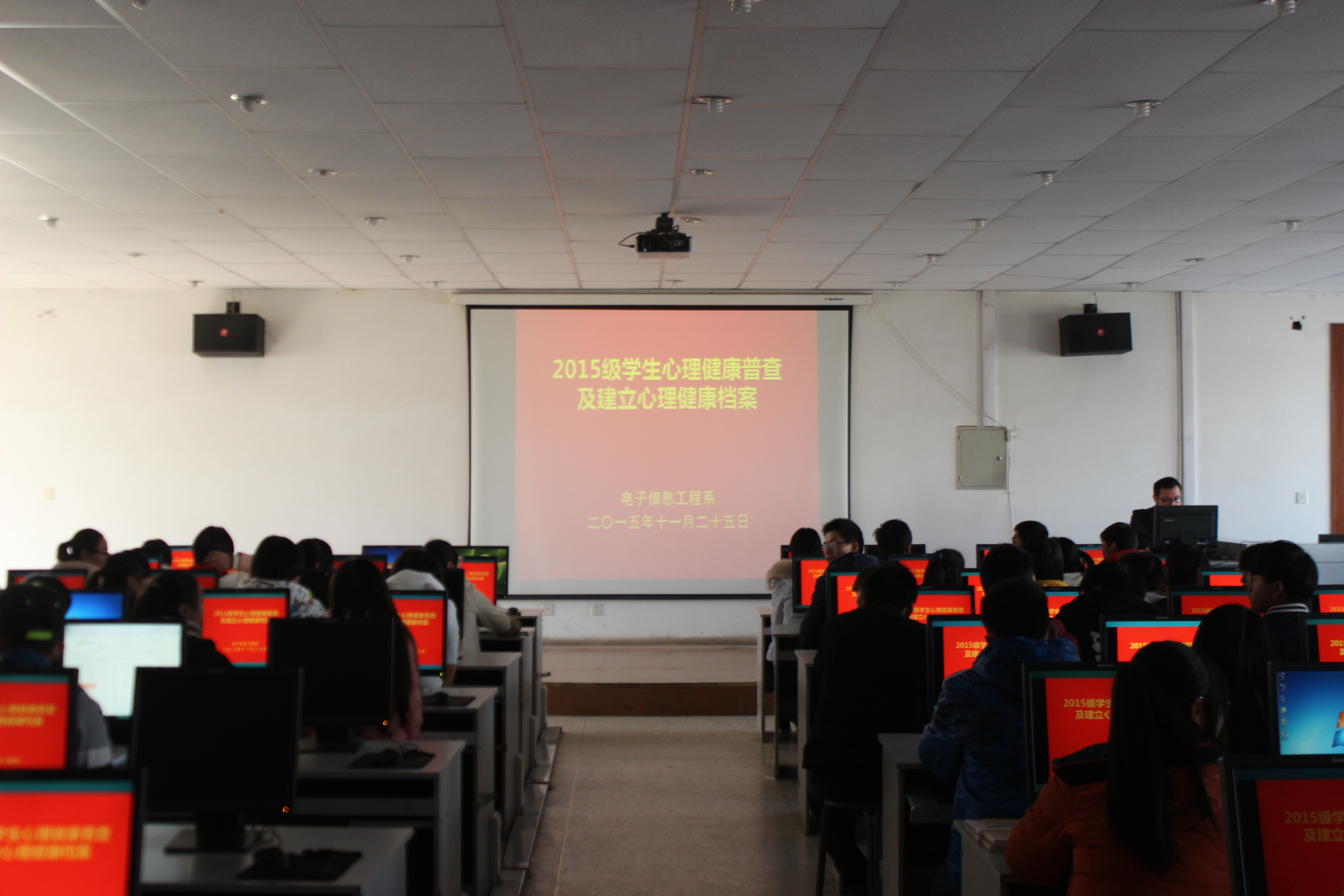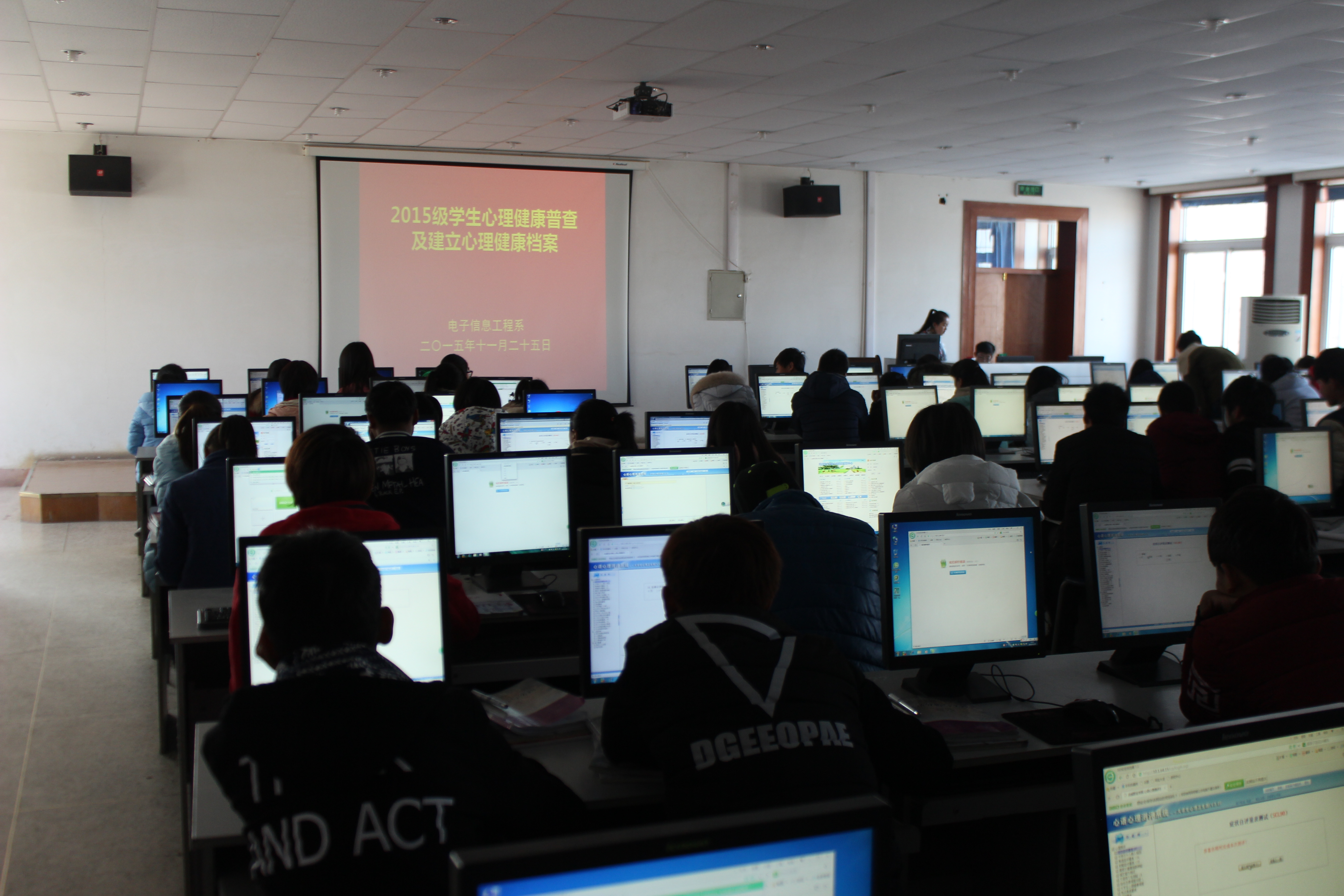 為及時(shí)掌握2015級(jí)學(xué)生的心理健康狀況,有針對(duì)性地進(jìn)行心理健康教育,按照學(xué)院心理健康普查安排及要求,11月25日12時(shí)10分,電子信息工程系組織2015級(jí)學(xué)生226人在尚德樓十號(hào)機(jī)房完成了心理健康狀況普測工作,并為每個(gè)同學(xué)建立了心理健康檔案。