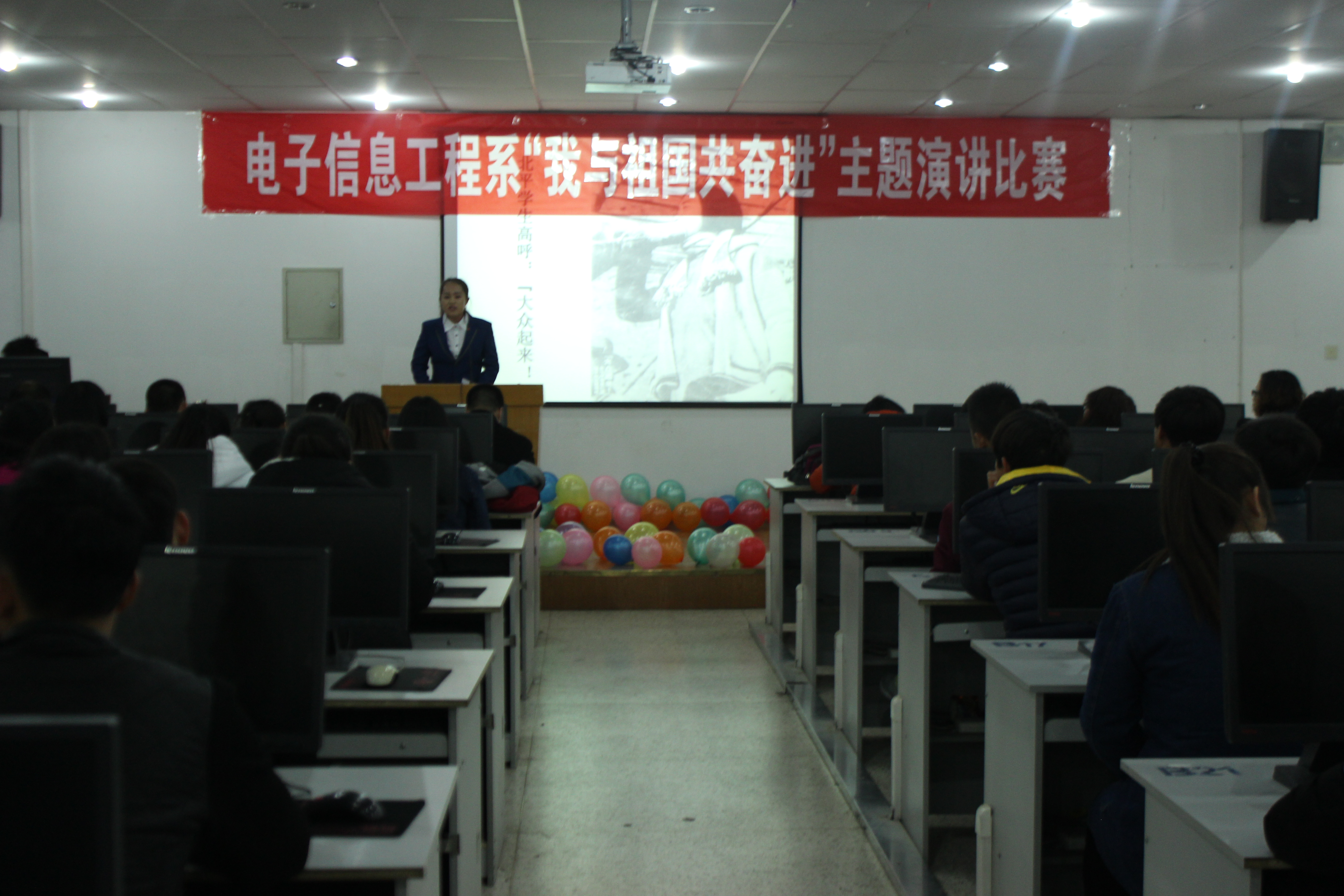 為紀(jì)念“12·9”學(xué)生愛國運(yùn)動80周年,激發(fā)我系青年學(xué)生的愛國熱情和報(bào)國之志,進(jìn)一步培育和踐行社會主義核心價(jià)值觀,提高學(xué)生思想政治素質(zhì),12月6日晚,電子信息工程系在尚德樓11號機(jī)房舉辦了“我與祖國共奮進(jìn)”主題演講比賽。電子信息工程系黨總支書記張伯成、輔導(dǎo)員鄧偉華、團(tuán)總支書記唐宗舜、全體班主任及系團(tuán)總支180多名團(tuán)員青年觀看了比賽。