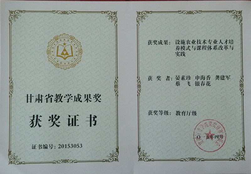 2015年甘肅省教學成果獎:設(shè)施農(nóng)業(yè)技術(shù)專業(yè)人才培養(yǎng)模式與課程體系改革與實踐