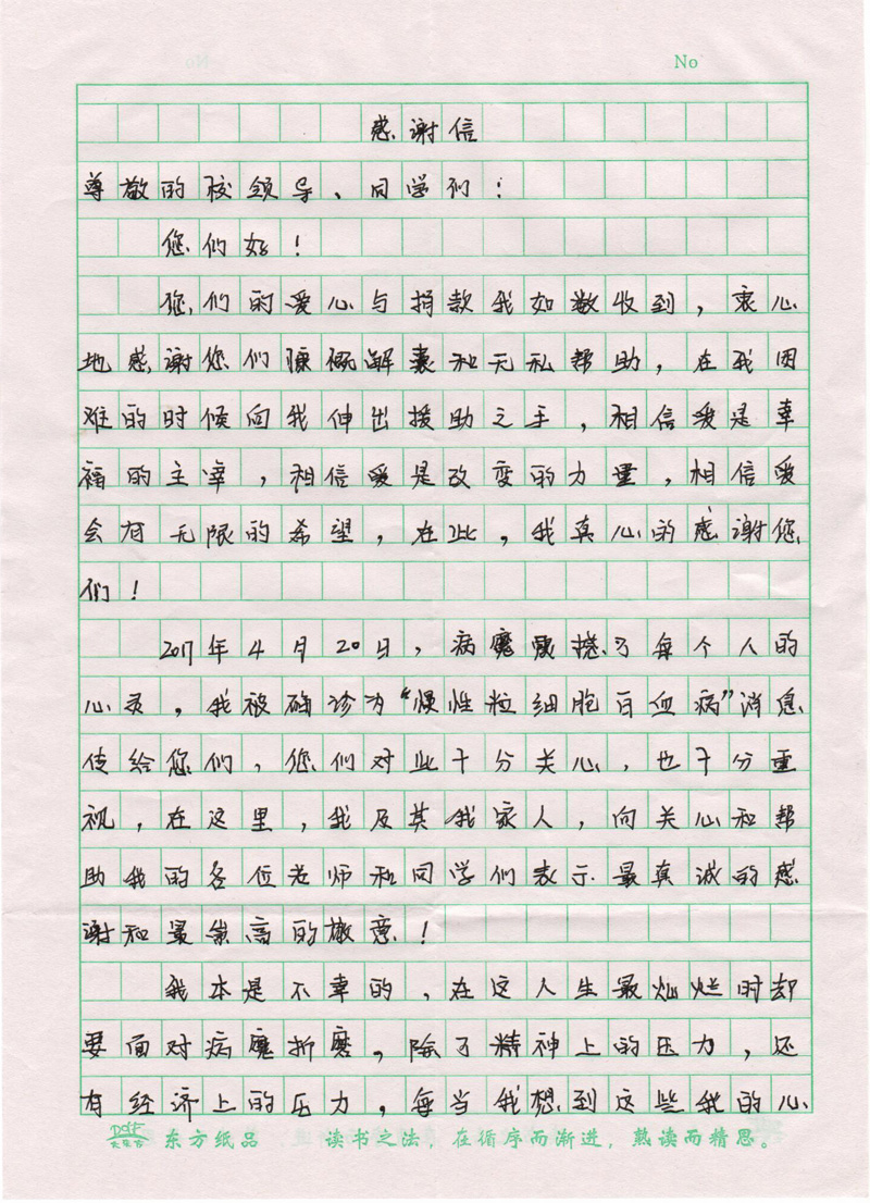 高國(guó)棟是我院機(jī)械制造系2015級(jí)機(jī)械設(shè)計(jì)與制造大專班學(xué)生,于2017年4月確診為慢性粒細(xì)胞白血病。得知這一特殊情況后,學(xué)院宣傳統(tǒng)戰(zhàn)部、團(tuán)委、學(xué)生工作處第一時(shí)間向全院廣大師生發(fā)出倡議,號(hào)召大家獻(xiàn)出愛心,幫助高國(guó)棟同學(xué)度過難關(guān)。學(xué)院廣大師生紛紛解囊,慷慨相助。目前捐助的善款已經(jīng)交給高國(guó)棟同學(xué)。為此,高國(guó)棟同學(xué)特意寫來(lái)感謝信,表達(dá)對(duì)母校廣大師生的感激之情。在此,我們衷心祝愿高國(guó)棟同學(xué)能在困境中迎難而上,樹立戰(zhàn)勝疾病的信心,爭(zhēng)取早日康復(fù),重返校園。