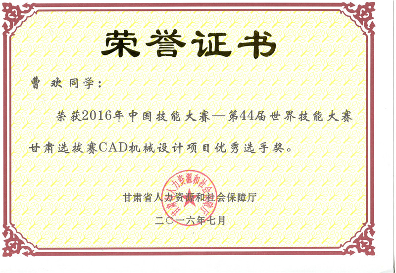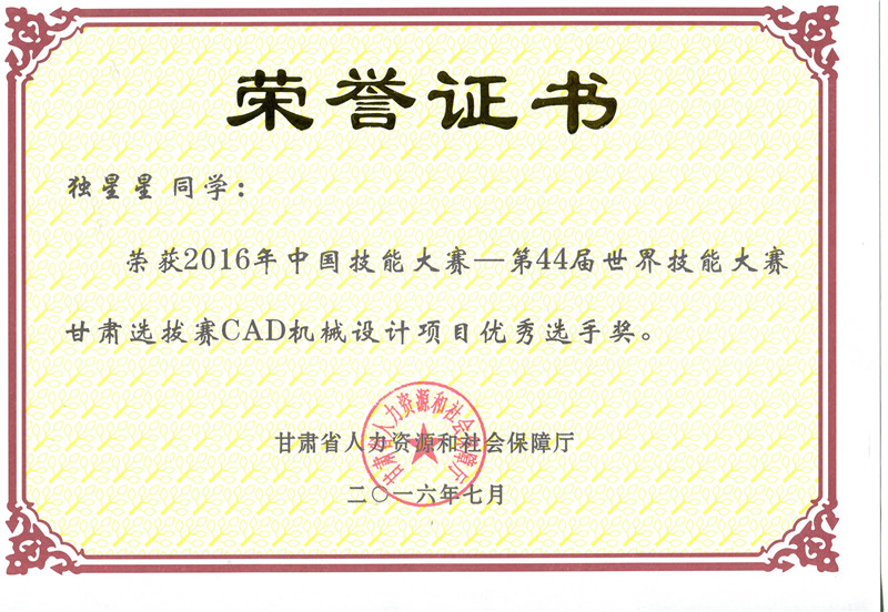 第44屆世界技能大賽甘肅選拔賽焊接項目優(yōu)秀獎