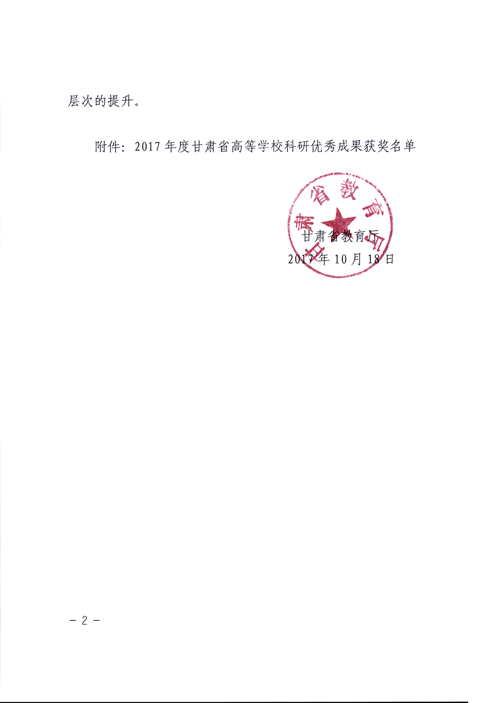 2017年度甘肅省高等學(xué)校科研優(yōu)秀成果獎(jiǎng)勵(lì)證書(shū)