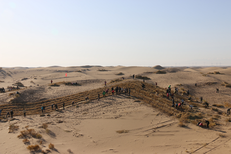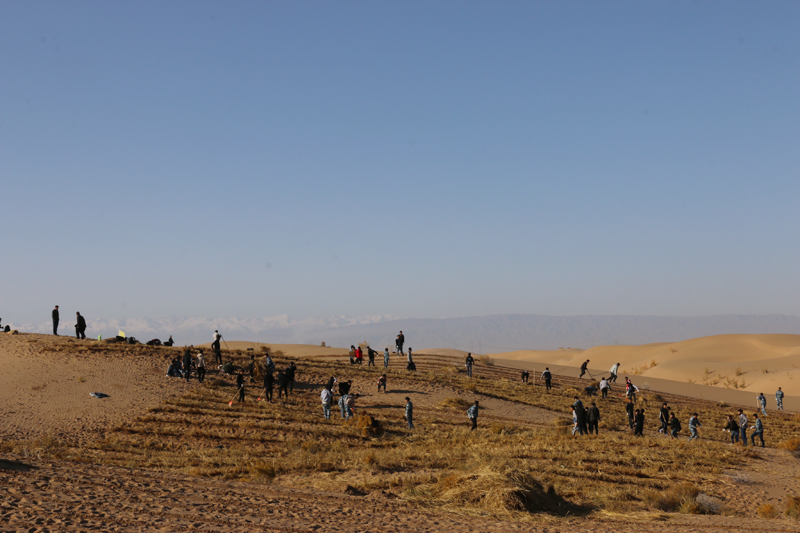 在勞動現(xiàn)場,學(xué)院領(lǐng)導(dǎo)和師生們不畏冬寒,分工協(xié)作,按照標(biāo)準(zhǔn)和要求劃線開溝、蒲草培沙、等距離推進(jìn),現(xiàn)場一片熱火朝天的景象。荒蕪的沙地身披新衣,整齊的稻草方格逐漸向遠(yuǎn)處的沙丘覆蓋。