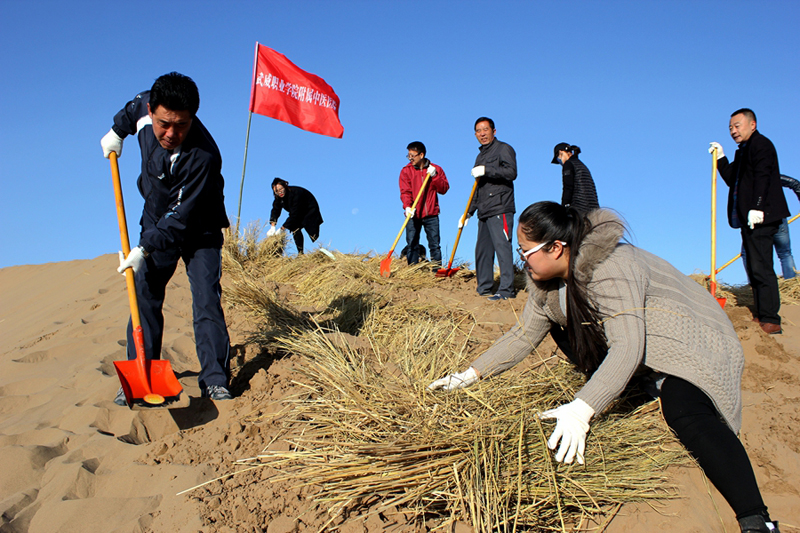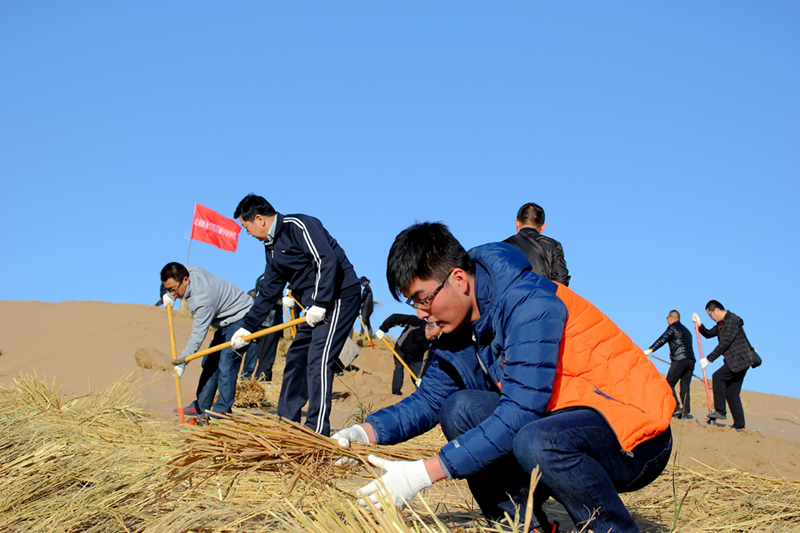 ?11月7日,按照市委市政府統(tǒng)一安排,直屬附屬醫(yī)院干部職工共計(jì)30余人前往涼州區(qū)榮生路南側(cè)八十里大沙頭道槽參加義務(wù)壓沙治沙勞動(dòng)。在黃沙茫茫的大沙漠上,鮮紅色的醫(yī)院院旗迎風(fēng)招展,醫(yī)院干部職工在沙丘上揮鍬開(kāi)溝、鋪稻草、培沙土、草方格逐漸覆蓋了一個(gè)個(gè)沙丘,沙丘上的草方格在陽(yáng)光下金光閃閃……